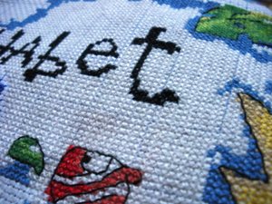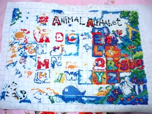 我考虑了一下觉得要是按照以前的想法,等都绣完了一起勾边,很有可能有哪部分没注意就没勾上的情况出现。所以改变了一下方针策略,决定还是从角上开始绣好了。不过其实是,左上角已经绣好一部分了,右上角几乎没怎么动,但是整个右半部分的进度要远远快于左边。所以考虑了一下还是从右上角开始好了。