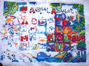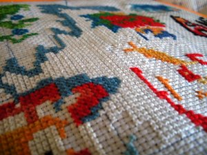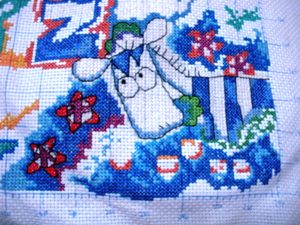 我考虑了一下觉得要是按照以前的想法,等都绣完了一起勾边,很有可能有哪部分没注意就没勾上的情况出现。所以改变了一下方针策略,决定还是从角上开始绣好了。不过其实是,左上角已经绣好一部分了,右上角几乎没怎么动,但是整个右半部分的进度要远远快于左边。所以考虑了一下还是从右上角开始好了。