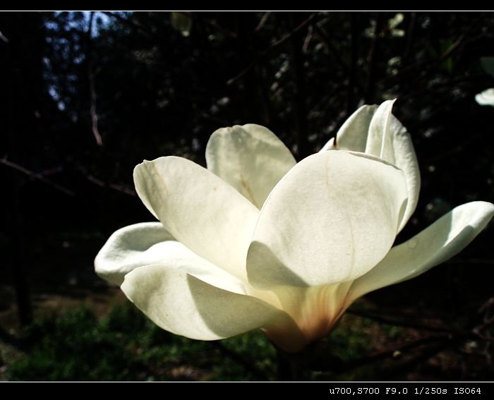 这个属于白玉兰吧?花瓣不多柔软多姿,我们学校里路的2旁全是广玉兰,要到5月底才开的,花瓣比较多,香气比较淡。