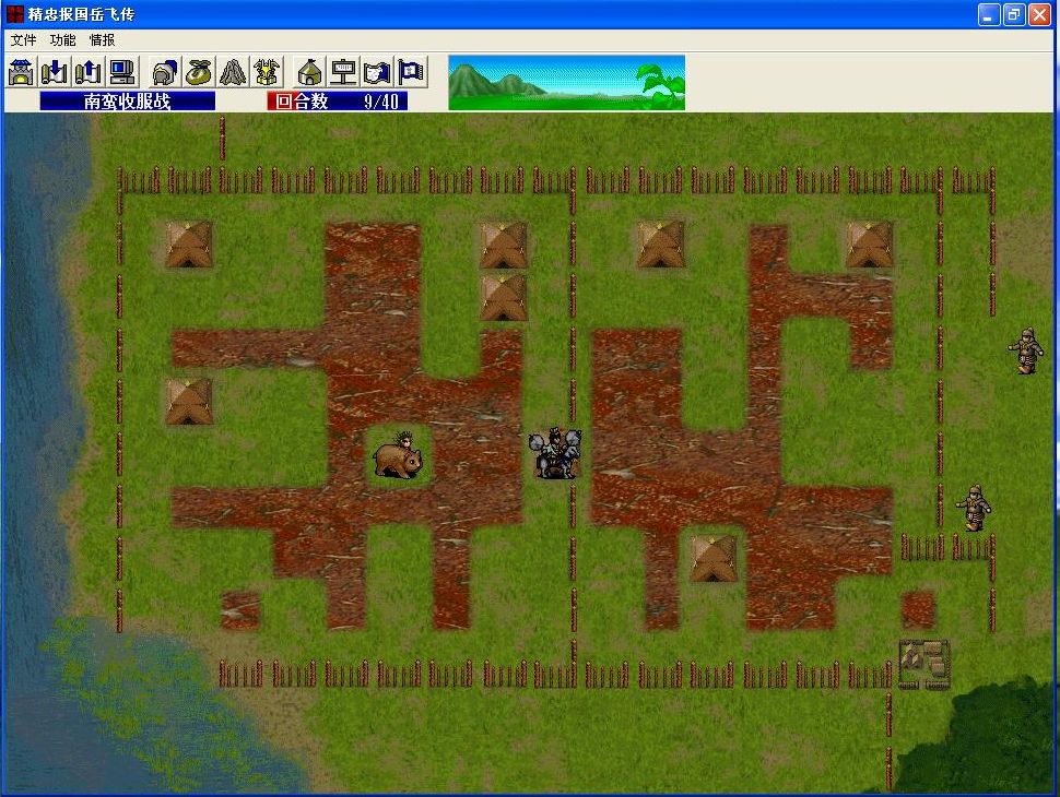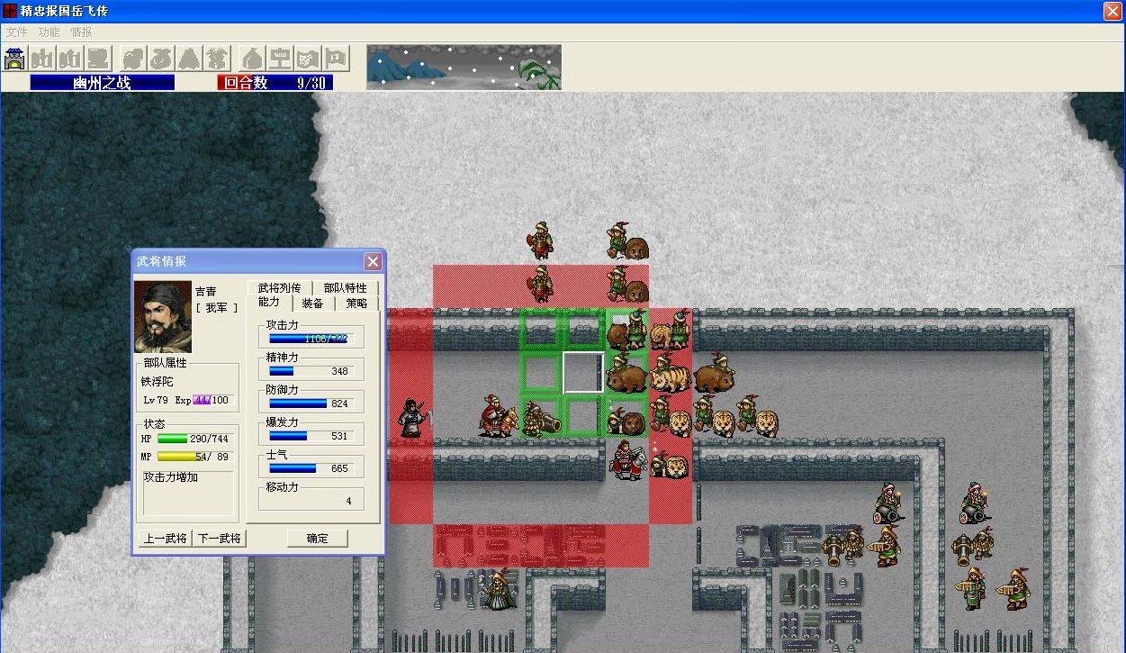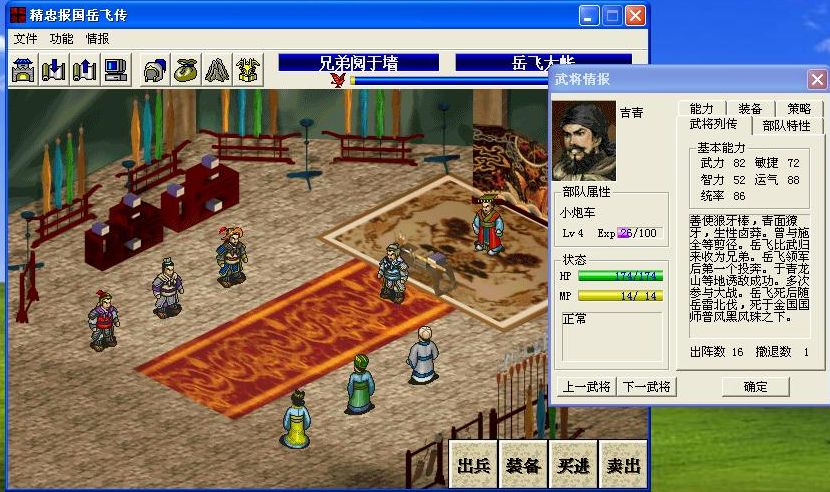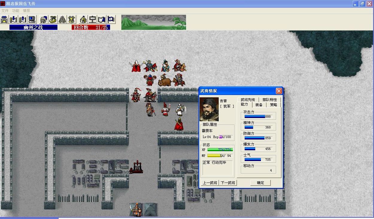 开了特技,可以出场了,因为他只有4级,MP不够触发特技,所以要给他穿上紫绶仙衣,这样一出场就自动触发特技了。注意本关开始出场的只有4个人,但是就算吉青没有出现,特技也会被触发的,为了避免浪费回合,选择武将时一定保证他跟着岳飞一起出场。