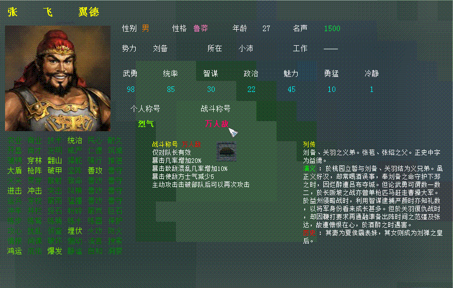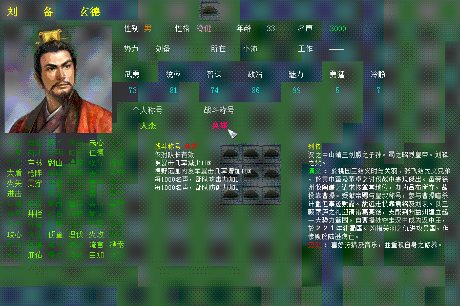 少数技能,如策略除"情报"外的技能,以及人物状态的技能仍没有完成。这部分并不包含在内政与战斗中,所以并不影响游戏。