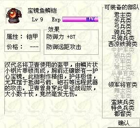 (3)兵种得到了修改。新加了领军都尉、统军、蛮族兵等兵种,修改了部分兵种。现在每个兵种在第一次升级后原有属性都有一项得到了提高,具体请见游戏介绍。有的兵种的攻击范围,hp、mp加成得到了改变,能使用的武器也得到了改变。所以看到新出现的兵种尽量多看看兵种介绍和武器准备菜单。