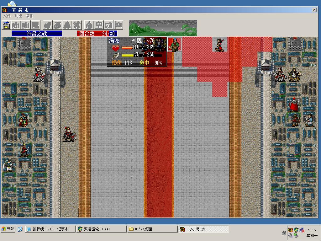 我军站在台阶前就行了(和最前边的敌人贴着站在一起,合计我方围一个城要八个人,有一个只要二个人就行),这一关我用了炮车,直接将城内的人打掉了,哈哈