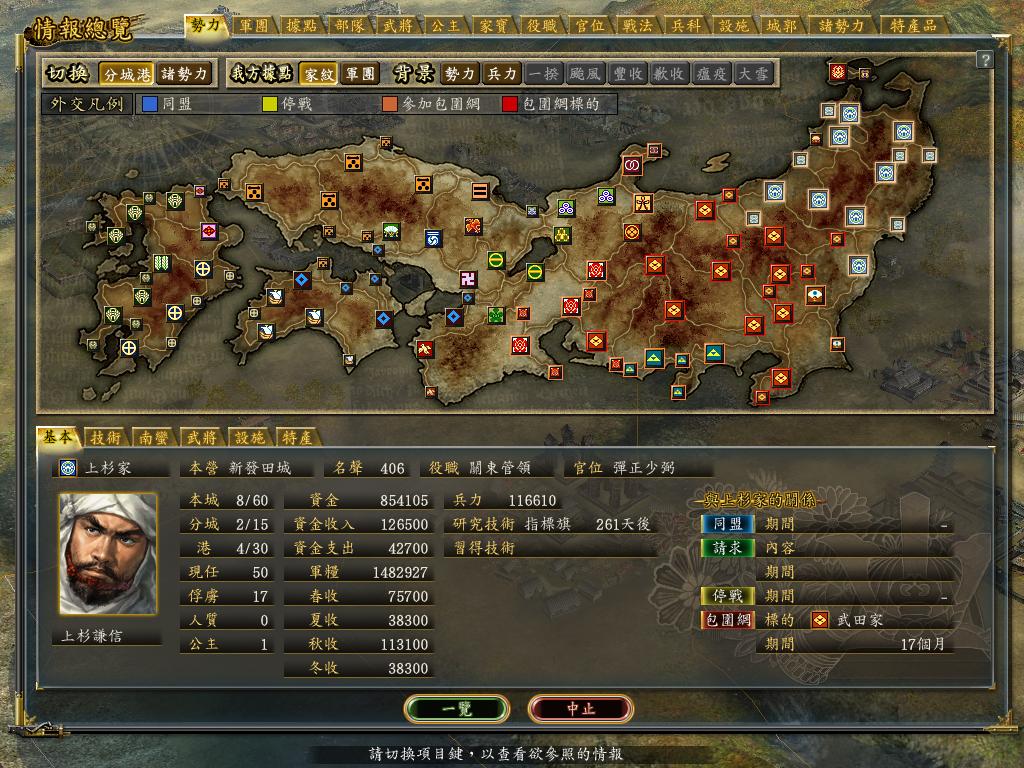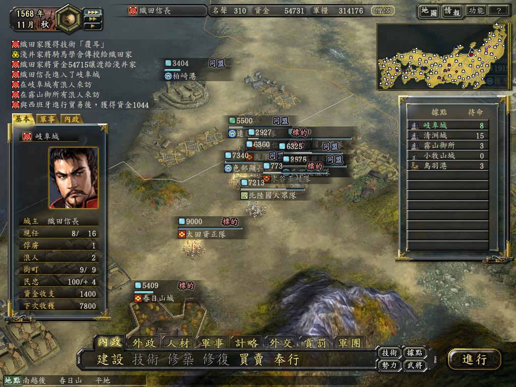 武田的骑兵太厉害了,我选信长,只有守的份,根本攻不过去,和军神同盟的,但是学不到好的技术.德川给他灭了,现在就在我城市旁边