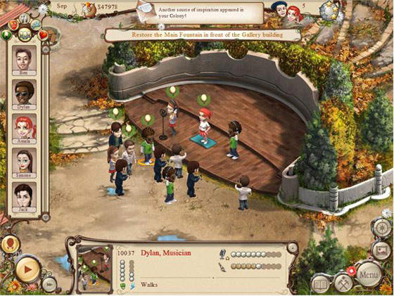 根据背景主题,本作设计了画家,雕塑家,音乐家,舞者,摄影师5大职业类别。按照逐个角色的兴趣爱好,将他们从新人培养为某个行业的大师。最为关键的是,这些艺术家们需要通过观赏建筑、植物获得灵感,去创作作品。当作品完成,会自动出现商人上门购买。赚取足够的金钱将帮助你提升庄园设施的修复和升级工作。