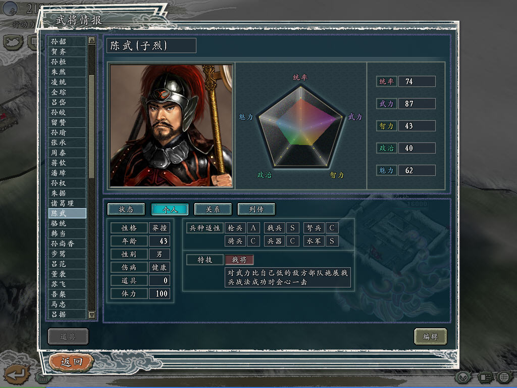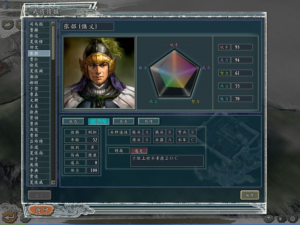 张郃(提升武力,晚成,成为曹魏第一将。特技改为遁走,纪念那次中计后还能突破蜀军重重包围的壮举)