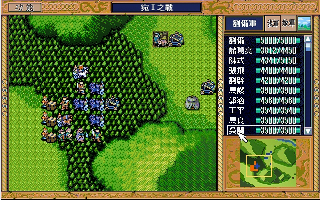 对这四个人再解释一次:刘辟其实很好养的,从瓦口开始前期反击杀伤并不大,后期往往可以让他单独行动,弄个村庄或鹿砦,放个敌骑(最好是名将)在里面就行了, 之所以要求后期追级的贼策略要高原因就在这里;剩下3个大策略者,陈式一个人有富余,按我的进度宛II以后3战都可以再上1个大策略;沙摩柯只需占4个位置就可以用襄阳青囊,所以只需再挤出1战即可;藩宫前面一直可以压级,按木之的成绩到雒I为47.93级,刨去2主将算47级,兖州之后只出了江陵、公安、雒I三战62回合,后面还有没有烧火机会要再算过,但即使现在就变战车也比关纯优了。请注意,关纯天然出成绩应计算到兖州为止,为40级左右,用补丁会高一些,游客丁是42级,再多就要挤占他人资源了。