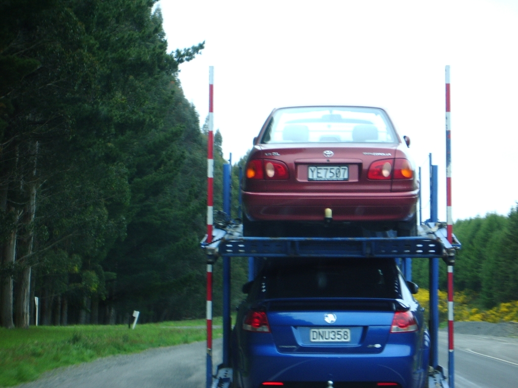 继续出发,在路上飞驰。也不知道是不是太早的原因,居然出门到现在路上一辆车都没看见,不过也好,不用担心什么警察了,所以可以以150+的车速狂奔。在通过了一片浓密的林区后,终于发现前边有了一辆车,赶上去一看,居然是一辆运车的卡车(话说下边的那辆车还不错的的,我比较喜欢,^_^)。在超过他的时候习惯性的按了几下喇叭,辛苦了,哥们,那么早就上路了。