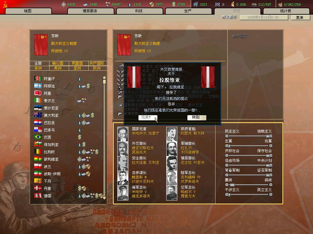 苏联向爱沙尼亚、拉脱维亚政府提出照会,提出签订新的互助条约,以达到控制两国的目的。不过游戏里没办法耍这些外交手段了,直接宣战吧。