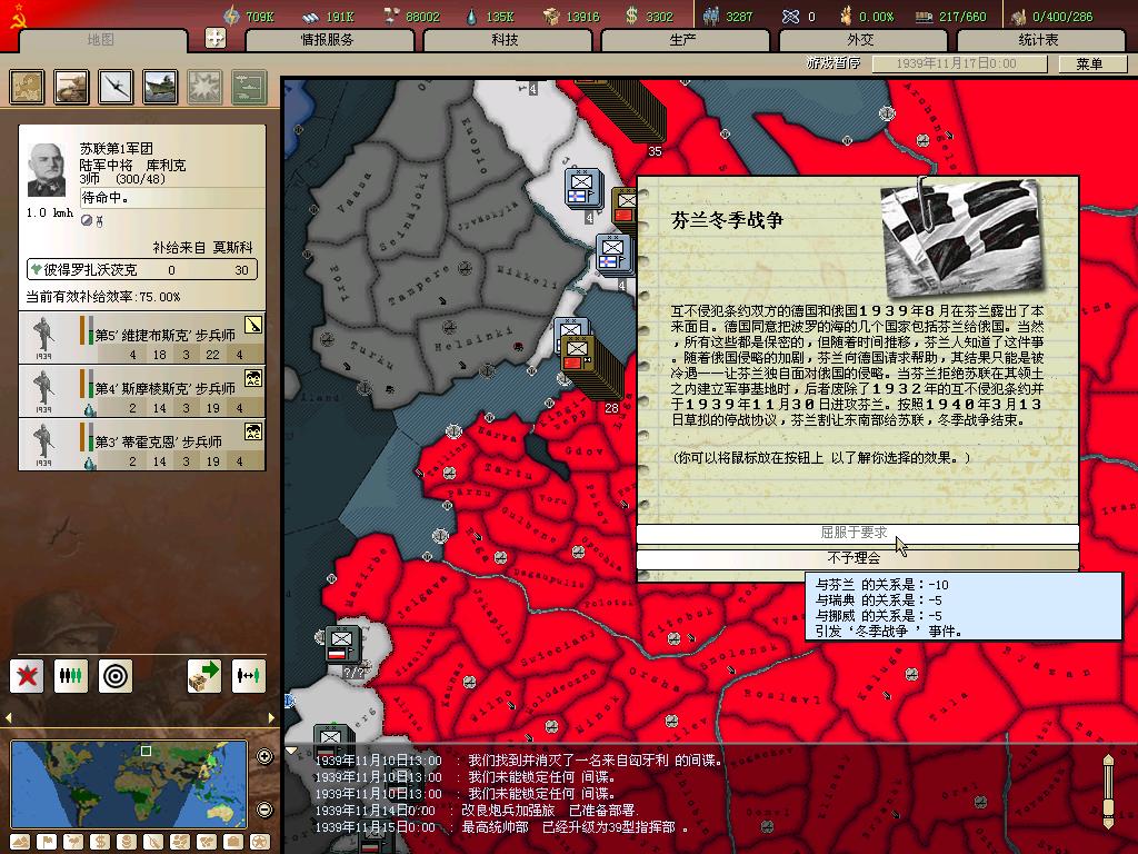 红军迅速深入芬兰内陆,英法等帝国主义国家领导的国联宣布苏联为侵略者,并开始为苏芬战争进行斡旋。但是考虑到如果此时接受芬兰的讲和,芬兰会在41年德国发动巴巴罗沙行动时加入轴心国作战,那样的话,苏联就必须在苏芬漫长的边境线上至少留下40+个师,这对于正面战场上想当吃紧的红军来说是不能接受的。现在,和英法美妖做买卖的好处显现出来了,虽然和英法等国关系破坏严重,但还没到-200的冰点,盟国不会因为一个小小的芬兰而向苏联宣战。次日,苏联宣布退出国联,红军继续向芬兰内陆的纵深挺进。
