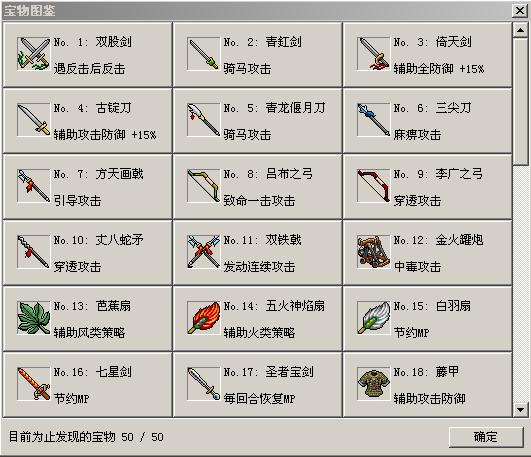 宝物图鉴见下图(缺的四件宝物是:青虹剑(攻击伤害+60%)、凤凰羽衣、两匹马)