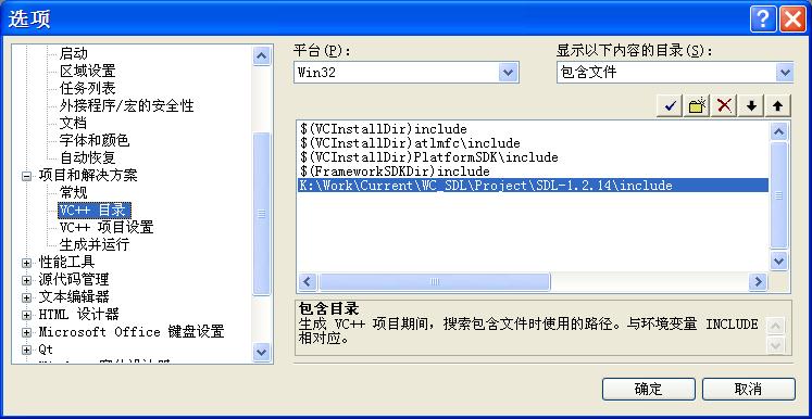 3.打开VS2005,作几项配置。选择“工具->选项”菜单项,在打开的对话框左边选择“项目和解决方案->VC++目录”,在右面的“包含以下内容的目录”里选“包含文件”,将Project\SDL-1.2.14\include目录添加进来(如图1)