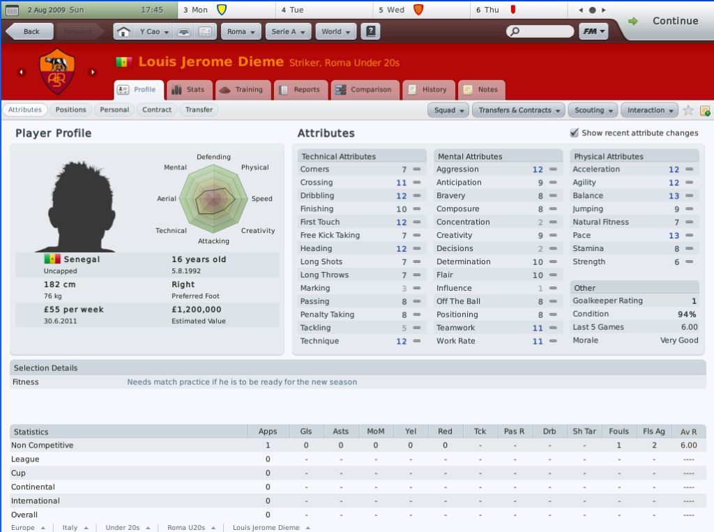 在应付完一群群记者的轮番提问后,我终于有机会和我的助理教练Christian Damiano坐在一起探讨一下俱乐部的情况。和我的情况完全不同,现年59岁的Damiano具有丰富的执教经验,他曾经先后在在富勒姆、利物浦、南安普顿、帕尔马和尤文图斯担任助理教练,也是因为他在这一职位上出色的表现,在上赛季结束后,Sensi就与赋闲在家的他洽谈好了合同,任命他为罗马的新一任助理教练。看着这位略微谢顶的法国人,我虚心的请教说:“怎么样,Christian, 毕竟你接触球队也有2个多月了,比我更加了解现在的球队情况,大概给我介绍一下球队的情况吧?”“没问题,大体情况是这样的”Damiano立刻捧出了早已准备好的一厚本资料递到我手里,并一一分析给我看,“在过去的两个月里,我对俱乐部进行了初步的观察。应该说从实力上分析,罗马俱乐部的整体实力还是可以在意甲占据四强的一角的。从年龄层次上到各各个位置上的配置,应该说现在的罗马还是比较优秀的。但是最大的问题就是现在的人员伤病。现在罗马仅仅重伤号就有Simone Perrotta, Doni, Bogdan Lobont和Cicnho,另外我们还有数名队员身体状况不是太好,我建议你在接下来的时候多对他们进行相应的观察和相对的体能训练,否则罗马势必将出现上赛季初大面积伤病的情况。””在接下来的谈话中,我们又交流了对战术方面的意见,他建议继续延续罗马原来的4-5-1战术,因为大家已经对这个战术有的一定的了解。当然,也可以尝试一下4-4-2中场菱形站位的战术,因为这个也是现在罗马比较适合的战术之一。他认为防守的核心是法国人Philippe Mexes, 而前卫中最强的则是Daniele De Rossi,锋线的首选依然是王子Totti。年轻球员方面,他指出Alessandro Malomo, Alessio Cerci和Louis Jerome Dieme都具有很不错的才能,只要新赛季给他们一定的机会,他们一定会取得巨大的成长。他同时,他建议在明天组织一场罗马和预备队之间的比赛,这样会方便我更加了解球队的每一个球员。