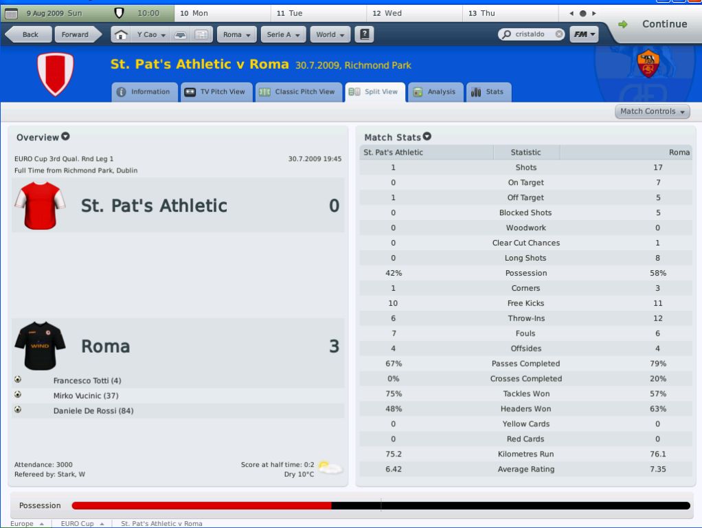 第二天,,这场热身赛我完全把球队的指挥权交给了Damiano,而我自己则一个人坐在空寂的看台上完全充当看客的角色。我要通过这场热身,尽快的了解球员现在的状态和个别并不熟悉的球员的能力。比赛应该说进行的波澜不惊,同想象的结果一样,罗马主力队以3:0的绝对又是击败了预备队。主力球队的又是还是明显的,而得分的更是我最倚重的两名球员,黑山人Mriko Vucinic和队长Totti。尤其是队长的最后一粒入球尤为精彩,他30米外的搭理远射,让Sergio毫无机会。同时,年仅16岁的小将Louis Jerme Dieme的表现也比较出色,面对主力队几名当家后卫,小家伙也用他的技术和速度制造了许多威胁,确实是一个可造之才。在比赛结束后,我出现在了球员们的面前进行了我与他们的第一次交流。我和Totti以及De Rossi都曾经是国家队的队友,私人关系向来都不错。在我和罗马签约的第一时间我就和他们通过了电话,他们两人都纷纷表示支持我执教并会全力和我配合。作为罗马的精神领袖,他们两人的支持会对我的执教帮助很大。而也有传闻说光头之所以不得不离开罗马,也是和这两人在足球理念上有一定不合的结果。初来乍到的我,当然是要对他们两人表示安抚和亲近,这样也利于我将来的工作。同时我也象征性的询问了他们对球队的看法,因为这样也能表示出我对他们的尊重。尤其是Totti,他年长与我,又是多年的罗马王子,对于全队的影响甚至会一定程度上会超过Sensi,取得他的全力支持,必然会给我带来无比的益处。