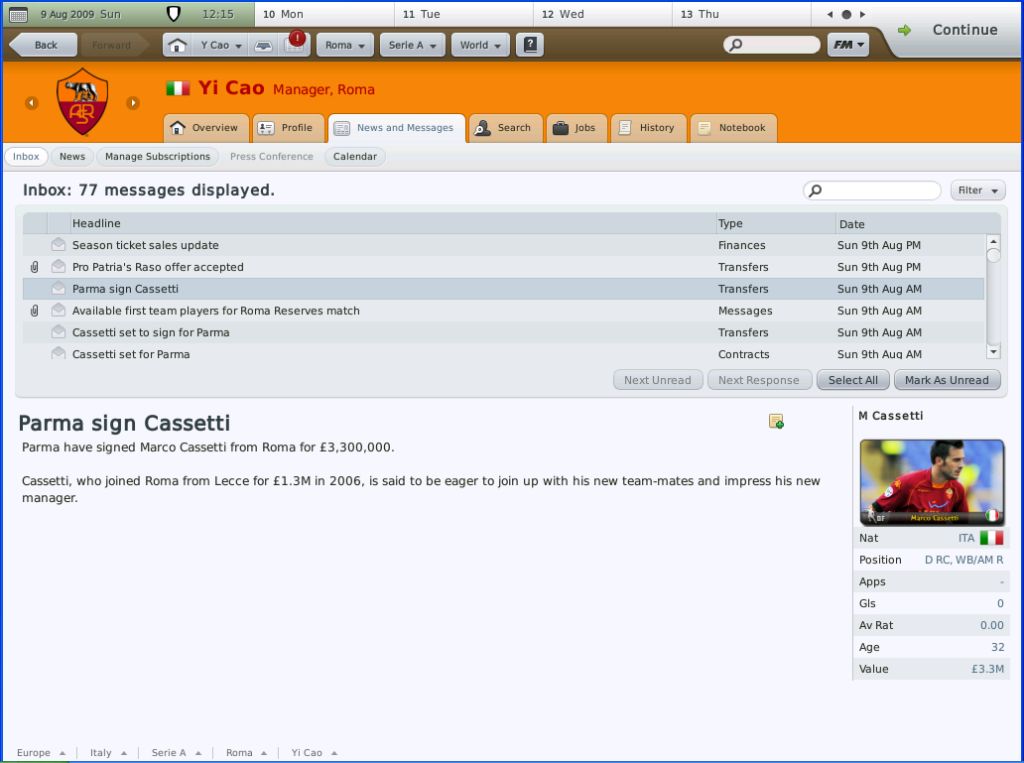 2009年7月14日,罗马俱乐部宣布,由于主教练Luciano Spalletti和俱乐部在人员购入方面存在很大的分歧,所以经过友好协商后俱乐部决定和其终止合同。而令人意外的是,虽然候选者有很多著名的主教练,但是罗马俱乐部主席Rossella Sensi出人意料的选择了毫无执教经验的我(^_^),作为球员的我还是经历辉煌的,现年仅仅29岁,曾经代表意大利国家队出赛33场并攻入9球。但是遗憾的是,在26岁的时候膝盖受到了一次重大的创伤,随后虽然经过多方诊治,始终无法恢复,不得不暂时离开了自己喜爱的球场。在过去的三年中,我完成了教练培训A级的考试,终于拥有了一个作为主教练的资格。令人吃惊的是,就在前几天我受到了罗马俱乐部的邀请,俱乐部给我一共了一份为期两年,周薪一万六千英镑的合同。作为一个完全的菜鸟教练来说,还是算一个不错的合同了。而且,作为罗马俱乐部的死忠,能够执教罗马也是我的梦想之一。同时我也知道,我现在毫无经验可言,来领这支在整个欧洲都享有盛誉的俱乐部,绝对是一个挑战。如果失败,就会很容易的把自己出于极其尴尬的地位,同时,也许可以毁灭我的整个教练生涯。但是我相信,有挑战才有高回报,所以我毅然决然的接受了俱乐部的邀请。