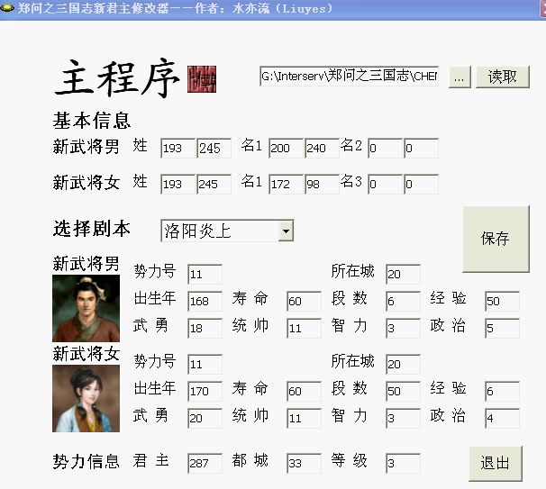 君主项填396表示新武将男为君主,填397表示新武将女为君主。等级1~3为皇帝、诸侯和群雄,5为流浪。