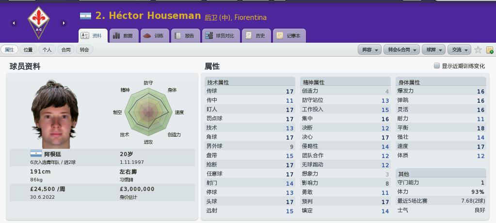 ,这个赛季换成了帕斯奎尔,就是现实里佛罗伦萨的左后卫……游戏里他退役后我签成了教练过了几年被意乙的维罗纳挖去当主教练,现在跳到拉齐奥