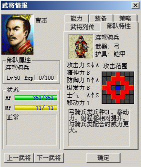 许多玩家玩《曹操传》时都应该看过“武将情报”对话框里的内容,其中就有“部队特性”一栏,如下图: