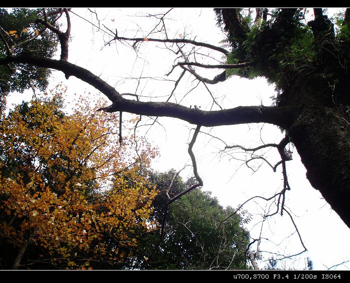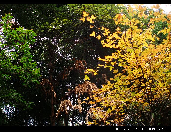 步入景区没多久,便惊喜地看到一抹金黄的枫叶。在未褪去绿装遗忘了秋冬的寒冷,沉湎的树木之中尤为显得珍贵,灿烂夺目。