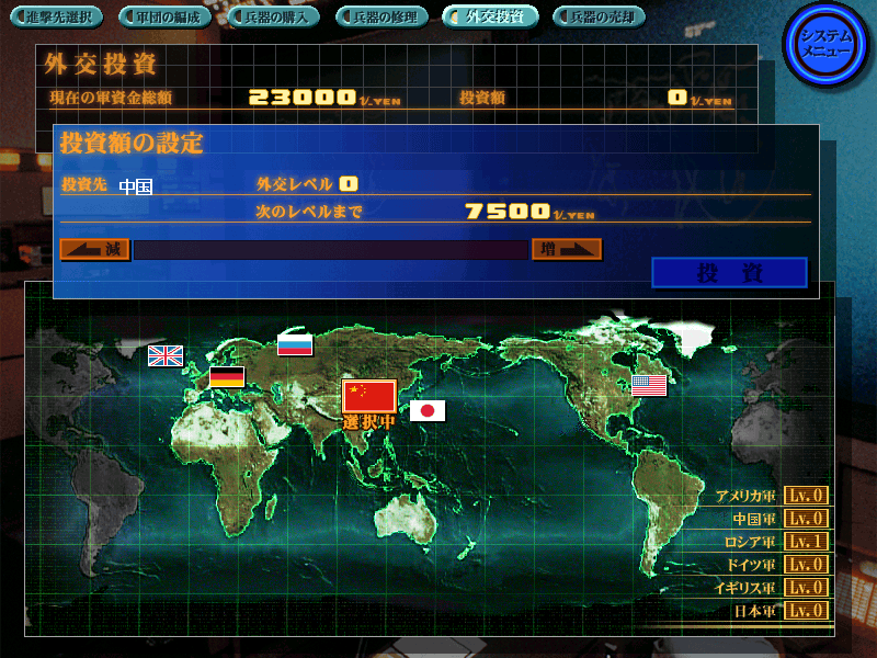 我改制了界面和设定,中国成为可以选择的一国,原来的美海和美空合并为美国(源于mf48的经典高分攻略的推荐),除中国的新加入武器,其他国家武器遵循原设定没改。