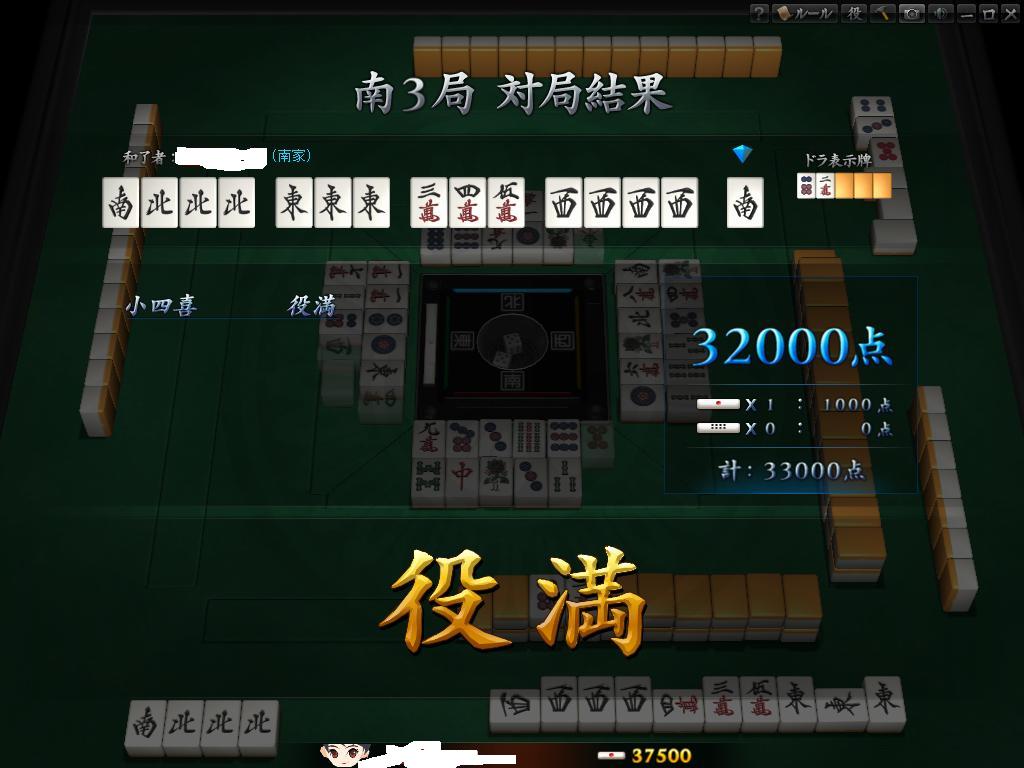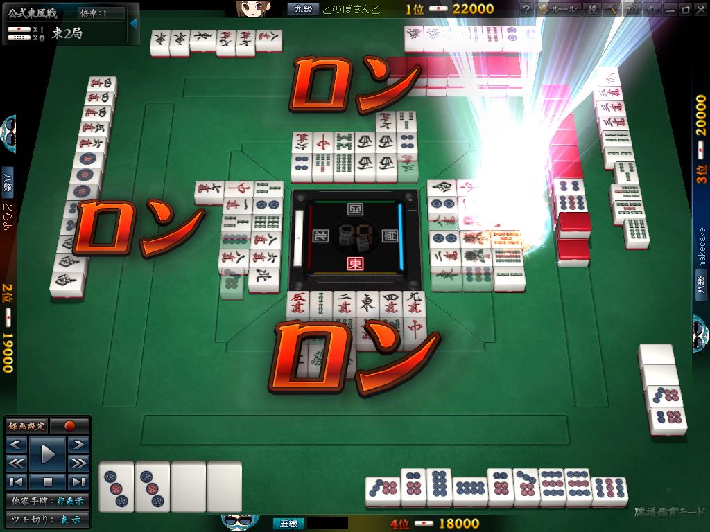 东1局,下家立直后放铳给对家(庄家)跳満18000,剩1000。