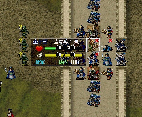 右边穿黄金铠的战神一时半会儿还解决不掉,就不管他,利用周灵的钝兵和八姐柴敢的连击大量消灭城内的敌人,中间的人有空给输送。