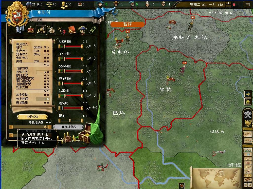 好消息传来,我们的商队终于在诺夫哥罗德立足,而帝国也有了6.49的贸易额.但是这还是远远不足的,更多的商队需要继续派出