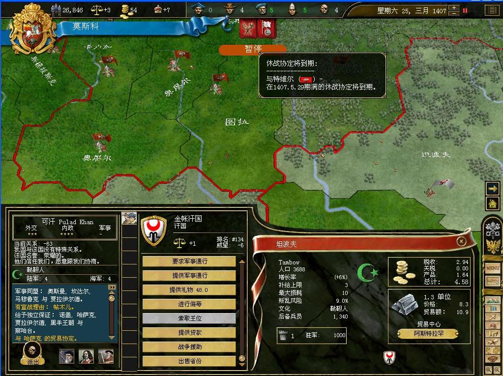 终于,在1402年5月,经过100多天的围困,尔热夫终于被攻破了,威尔特全境解放.可惜的是,因为威尔特并非自会有首都一个省份,所以这次不能吞并了,只好忍痛只要求其割给我1块地,另外给我25金币.等着,我们5年后还会来的