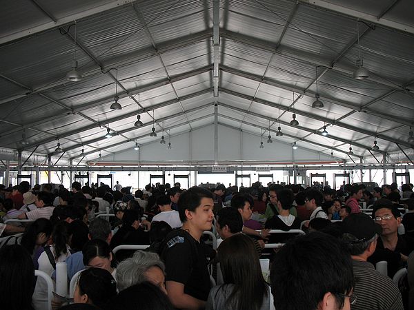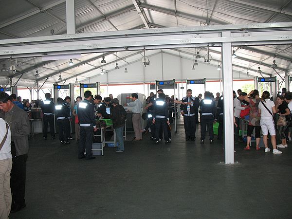扔掉这些东西,为了你能更快的通过安检,安检的规格是机场登机的的规格。你在出示门票之后可以进入蓄检区,蓄检区是一个白色栏杆的折返蛇形通道,我们8点40样子到,蓄检区基本已经排满了,我们排在了最后。排队、折返蛇形通道,这是世博会最常见的故事。