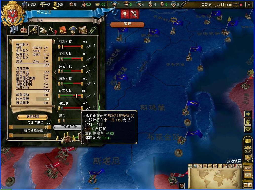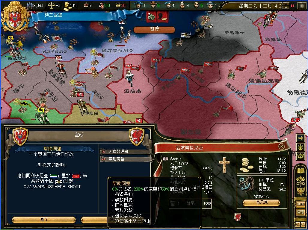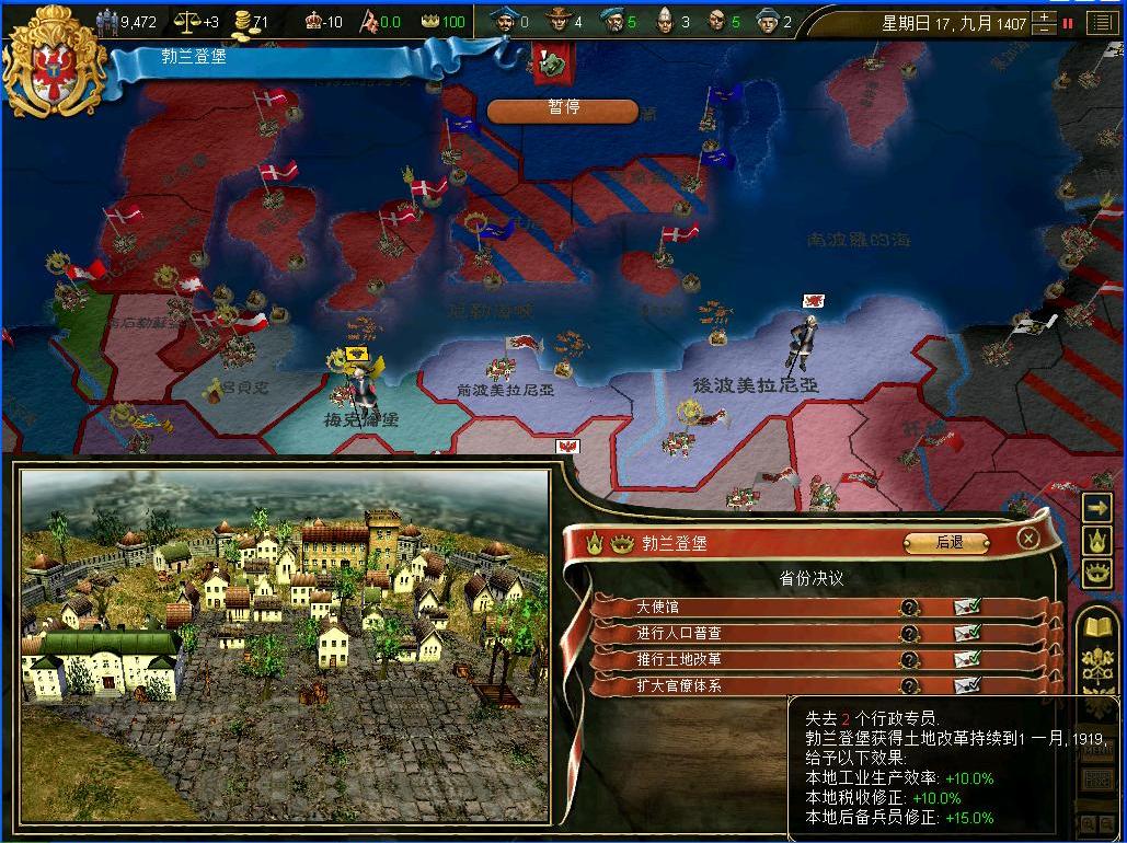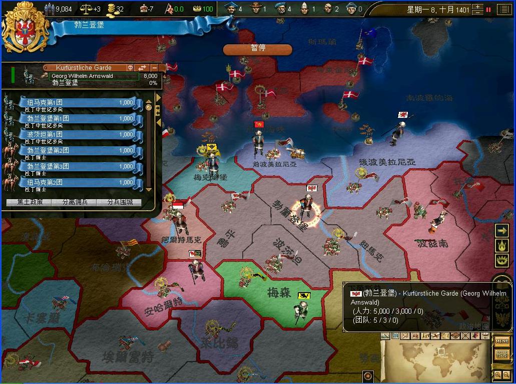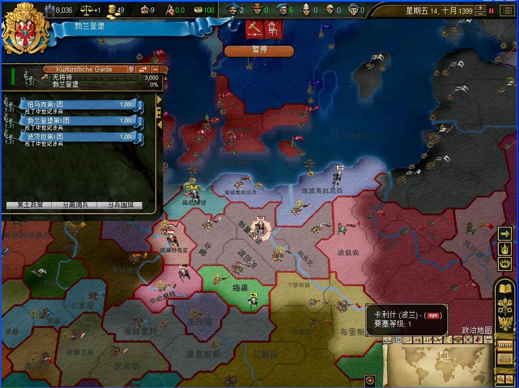 1399年的勃兰登堡,拥有勃兰登堡,鲁平,波兹坦以及钮马克四个省份,军事实力一开始比较孱弱,仅有3000步兵.更可怜的是....居然是在卢森堡的联合统治下.....完全没有自主权的国家.....开局应该会比较辛苦