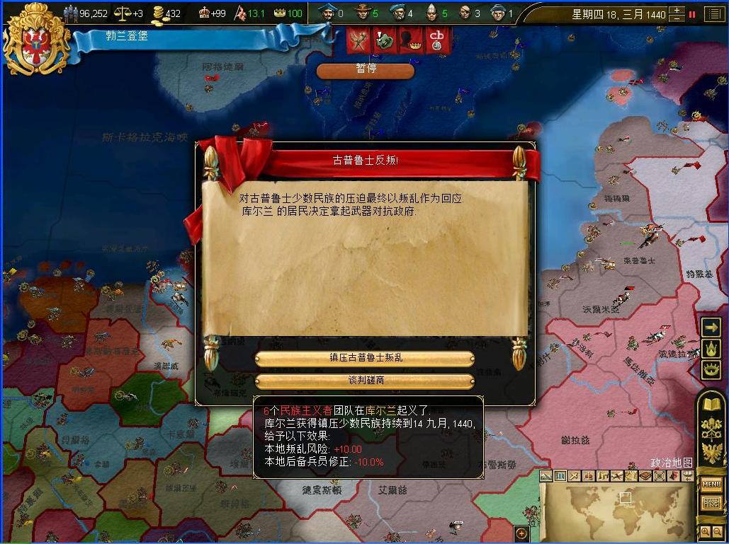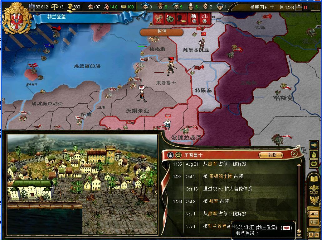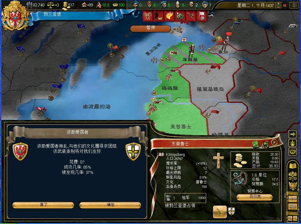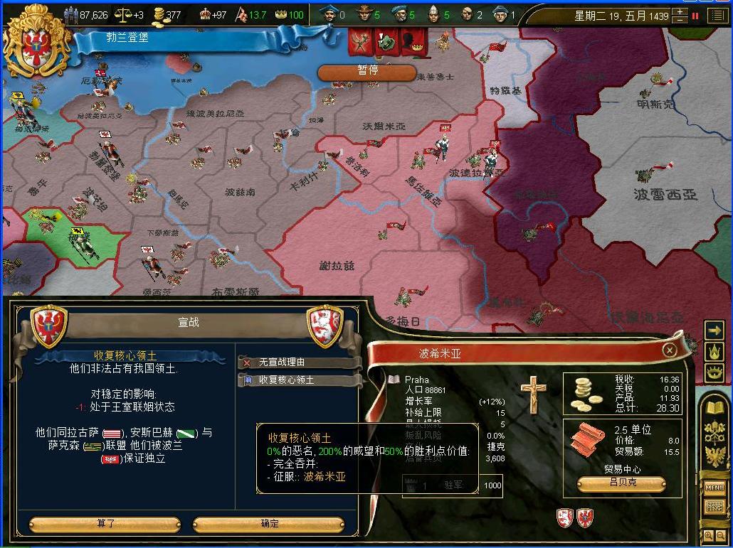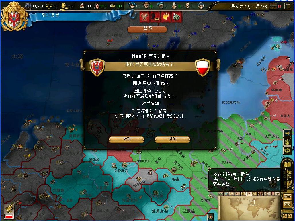 开战后观察了一下外交情况,还算不错,还有几个同盟和我一起作战,西线有两个敌国,都是小国,而且有一个隔着太多国家,没威胁.东西波兰是大敌,但是第一军有15k的兵马,而且大将领军,可以纠缠一段时间,只要西线完成任务,迅速吞并,回军东线,估计就没有大问题了.