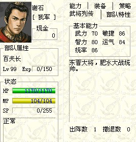 STAR 5.6发布的文件中 102号人物就是一个特别人物。当他作为我方武将加入时,过关后在使用连续出战就会提升所有出战人物的基本能力。且以后所有连续战役人物基本能力都会增加。我的102号人物是夏侯惇跟着曹操出来打官渡,于是这个特殊的102号人物就出现了。另外发现成长数值和前关杀敌数有关,智力60的人到下一关可以升到90。