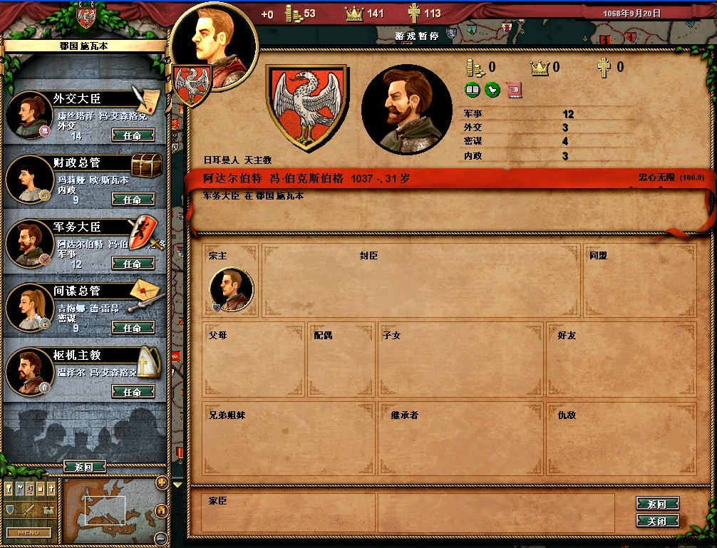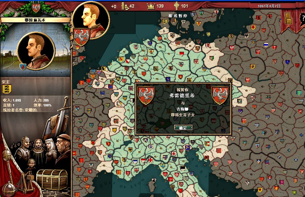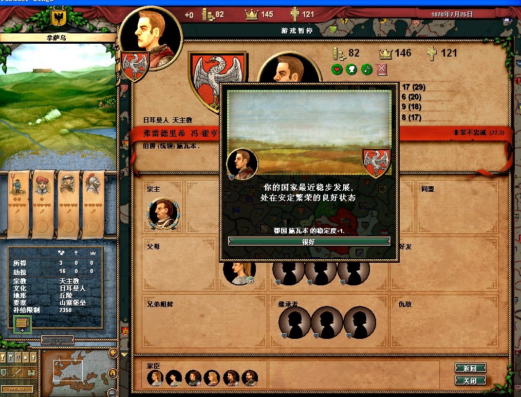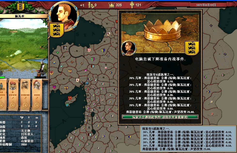 弗雷德里希的属性还可以,领地的收入很垃圾。把法律更改一下,目前我用的是血亲继承权,君权至上,以及王室成文法(目前没封臣,用这个法律军队强)
