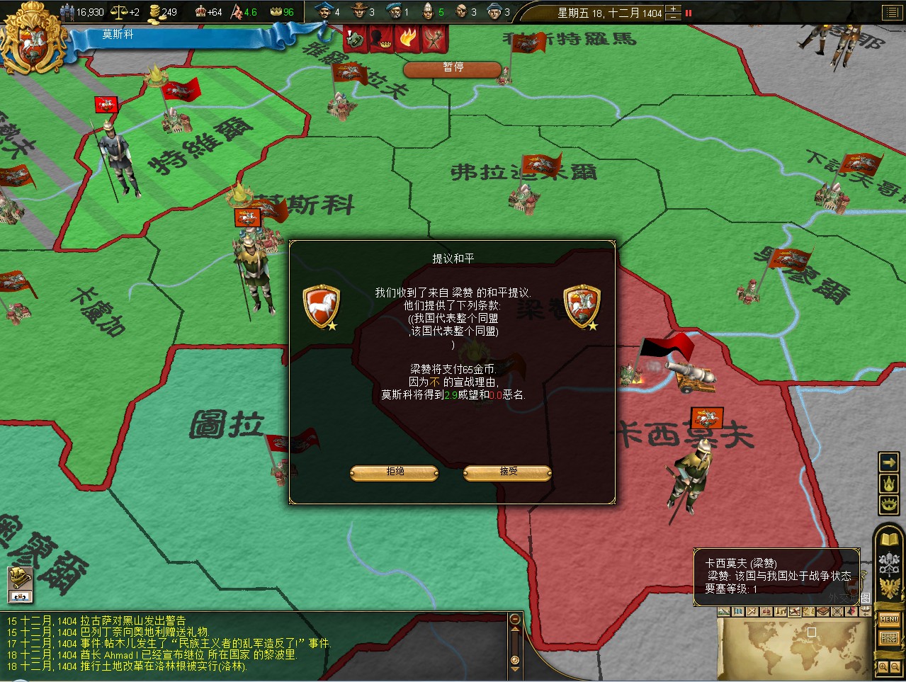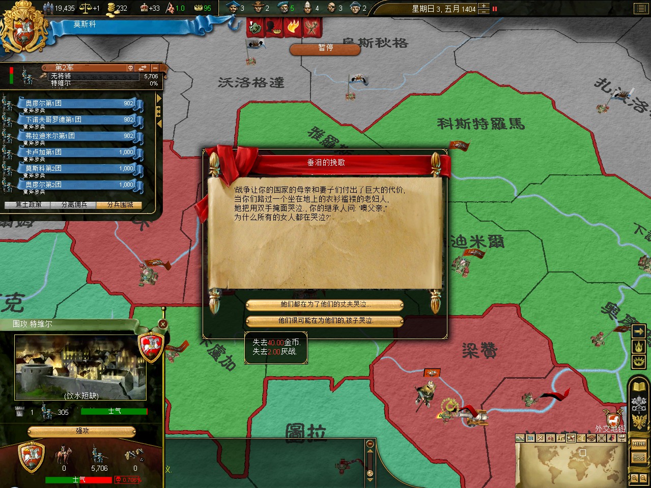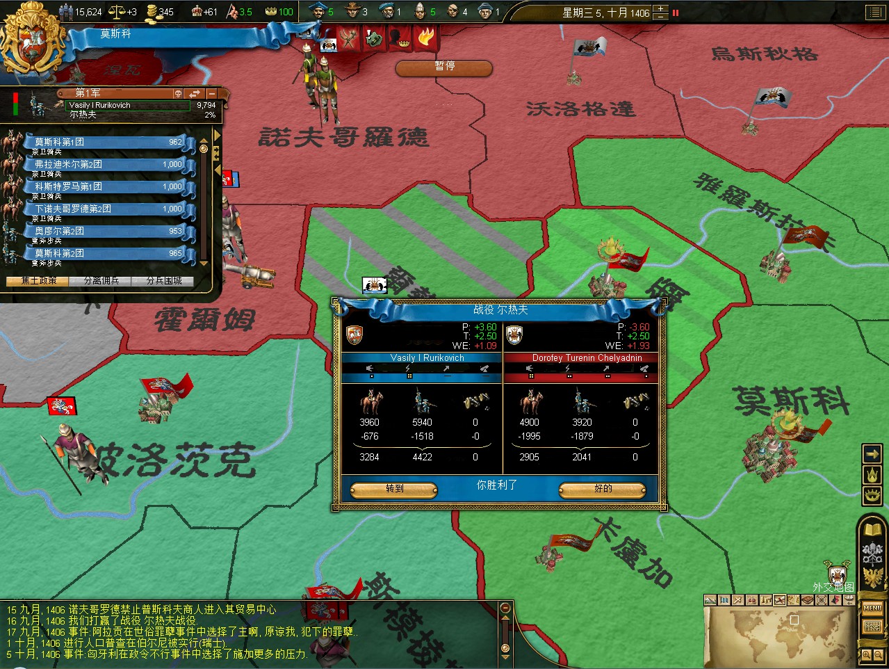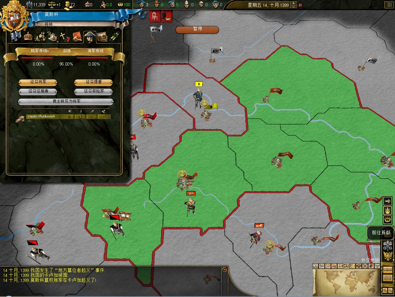 开局拉一格中央,其实这是坏习惯,莫斯科初始才5000兵,但如果拉出叛乱在莫斯科,刷出1w3的叛军,可以直接重开了。不过这次运气不错,叛军在卡卢加,还是篡权叛军。这样正好帮我挡住了立陶宛的两股民族主义叛军。民族主义叛军占领后会加十年的民族主义,而篡权叛军没惩罚。