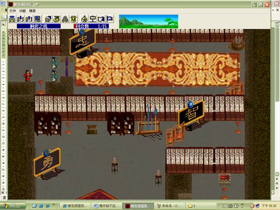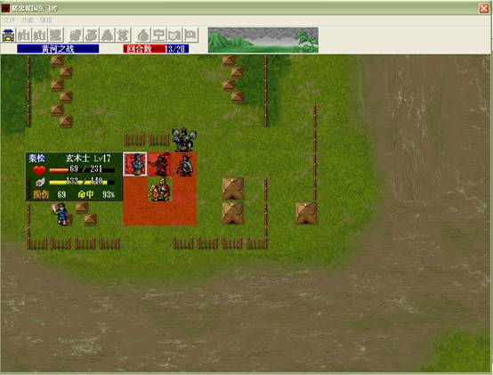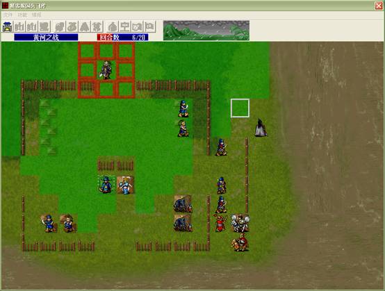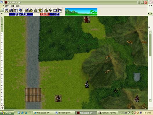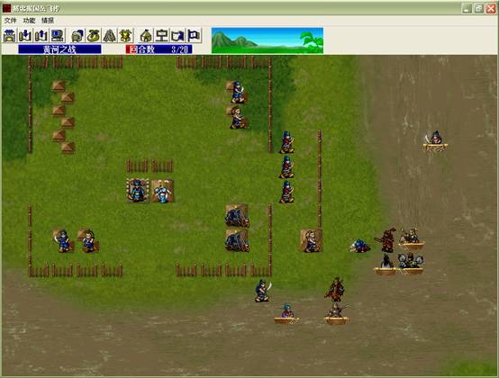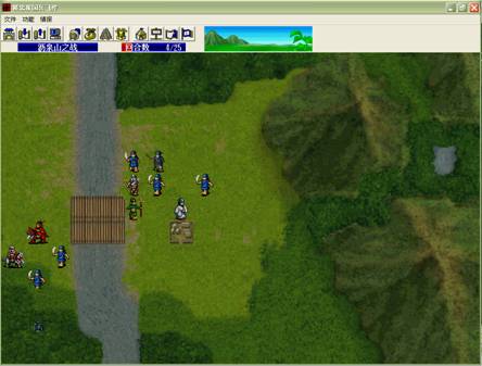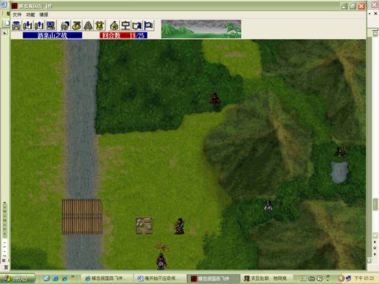 很多人都说第三回合才把伏兵引来,可是我不同意,因为这样 = -1回合所以第二回合马上引出他们,吉青组由岳王挡住,其它人马上过桥(图1)