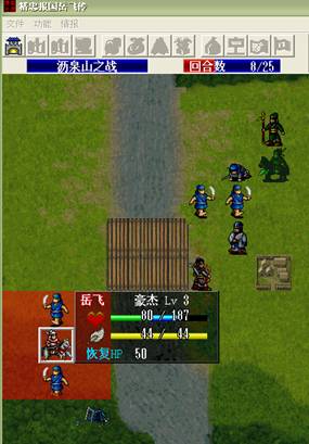 4.第8回合:上回合诸葛左移一格,王娆到诸葛和张之间,汤上移一本回合王张打施(均无双无暴,很简单,不须过度S/L,本人不喜欢S/L,所以本攻略不会过度S/L,顺其自然)诸葛补法打残)岳帅吃粗粮吧,不要让HP太少(图5)