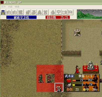 下回合待女经过道士放毒和禁军,剩下50~60左右的血,可以由黑风高击退;两友军骑兵都被敌军击退.王佐最大范围降士气,王贵顶在折旁边暴击骑兵,由友军击退,施全给王贵加防,牛吸引连弩的攻击,注意不可以让梁红玉把连弩打残,因为残兵先行动的原理会令局面失控.s/l折彦质反击骑兵暴击. (8)