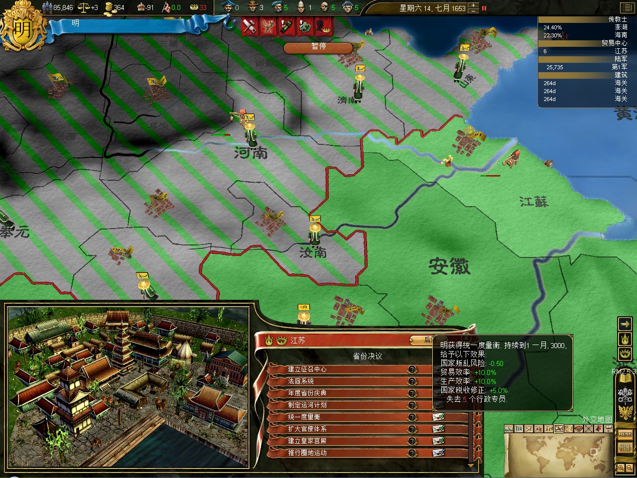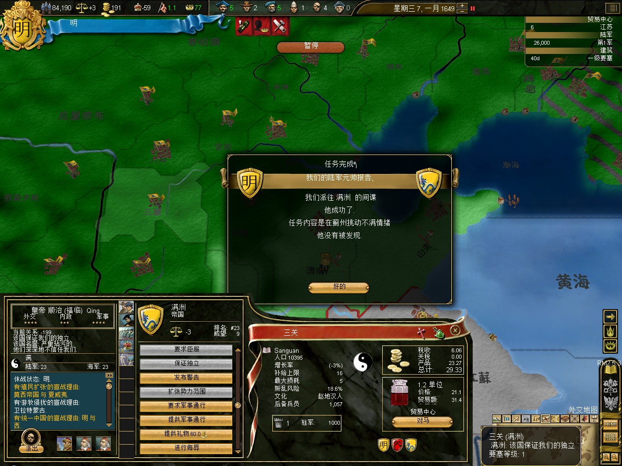 常例开局。话说三个南明剧本 1645 1652 1659,都相当BT。尤其是1659剧本,基本是不可能的任务嘛。1645剧本和1652剧本比较,1652剧本把张献忠的地吞了,兵略多些,还有个BT的李定国,但是1652剧本的南明有两个致命的弱点。一是东面被建奴占了一大片领土,这让我军无法迅速的以最小的代价来与建奴议和。二是江苏丢了,没有了江苏,经济上此消彼长,相当头痛。