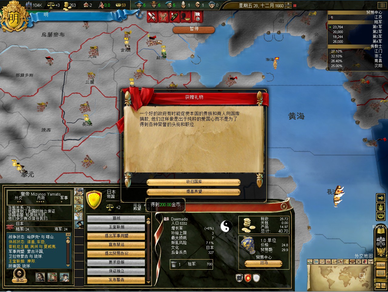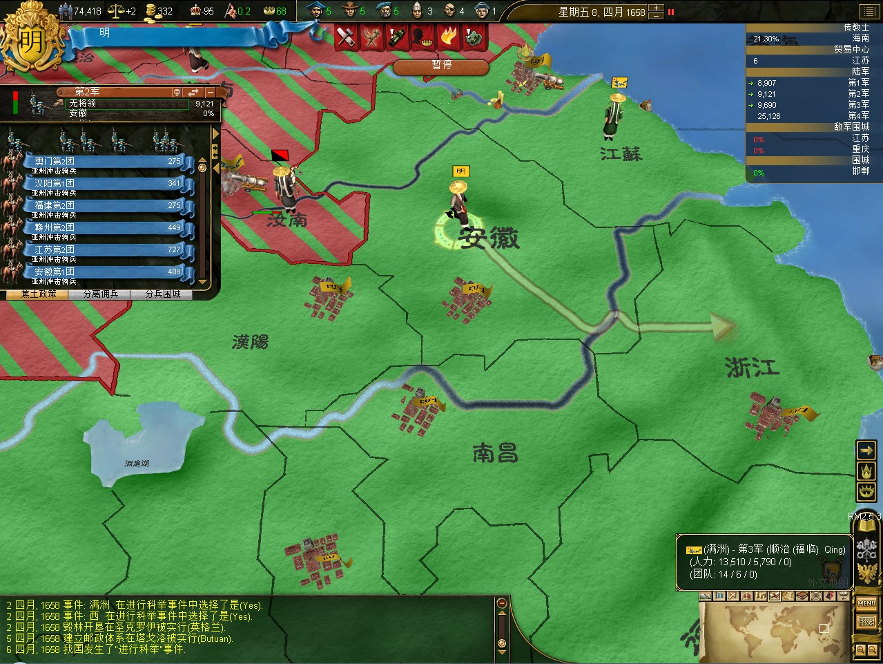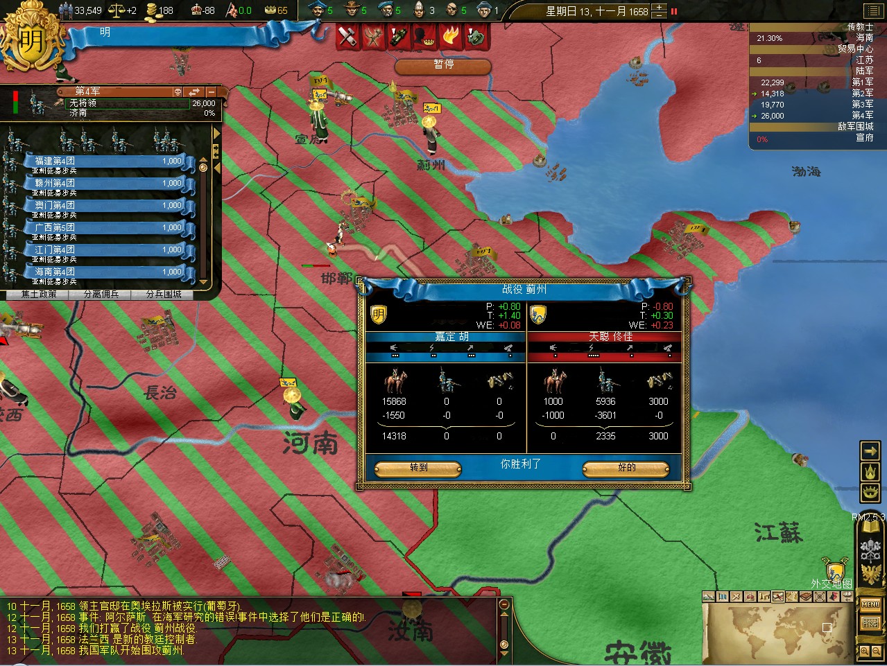 汇报进度。明代中国全境收复,建奴全灭,逆推尼德兰。现有领土:明代中国,满洲,朝鲜(对马(日占),郁陵(朝占)除外),越北,尼德兰旧领2处(包括一个贸易中心),夏威夷,非洲与南太平洋殖民地数块。时间1720年。明日补战报。