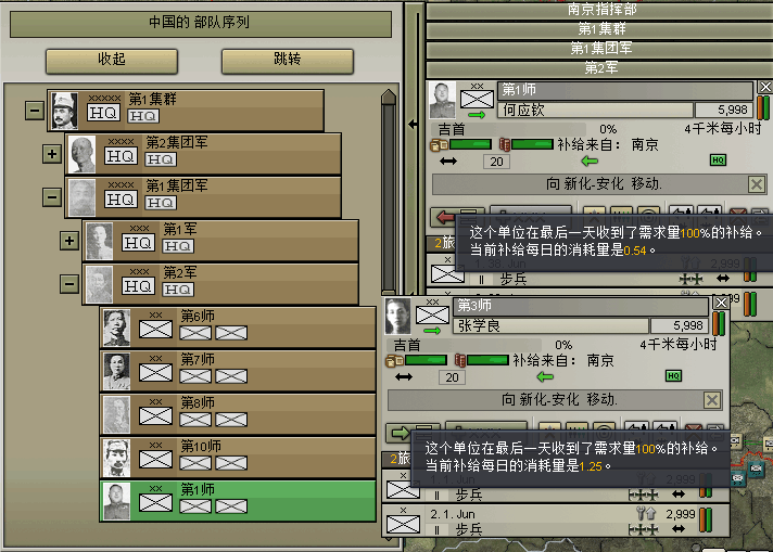 部队军官率高达164%,组织度高达54,平均部队经验度35%。