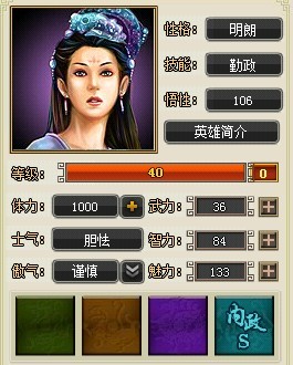 好了,现在你的铜钱产量比较可观了,给媚娘练级吧。带满麻袋上路,哪里路不好就去哪里,媚娘悟性这么高,想慢点练级都难阿。升级了就随便派个武将运麻袋过去补充,尽量保持高带兵,这样练得快。至于升级加点,有加智力的,也有加魅力的。智力加点带兵量少一些,都满编的话,单次效率是不如魅力加点的,但是省点铜钱。不过既然追求高效率,我还是建议魅力加点。30级之后天赋加大将之才,这样35级就满了。装备要求也简单,有一个+1内政相性的就好了。