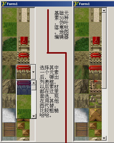 《地形编辑器》的30个元素图片是固定的,MM的元素图片是可用下拉列表框选择的。其中的数量多少,取决于元素库的储备质量。比如可以把红警,帝国,文明游戏中的桥梁,放到我们的“桥”元素中。