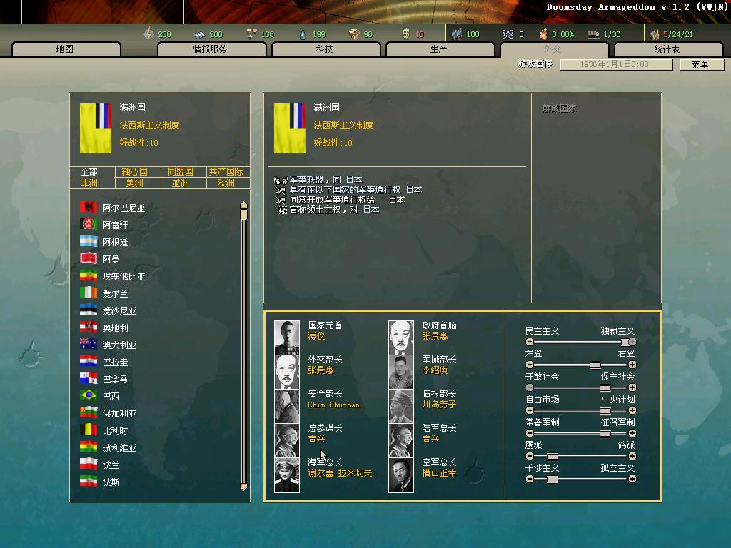 言归正传,傀儡国没法玩,所以开局先进日本放弃了对满洲国的傀儡权,然后进满洲国开玩,设置如下: