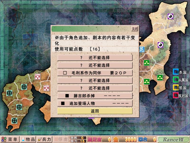 一周目被主线剧情赶的相当狼狈,所以二周目打算走猿杀这条无主线的纯SLG路线,全国统一后通关。追加猿杀10点,剩下46点可分配。追加势力是严重破坏游戏性的选择,所以就算一周目达成三妹抖,但也不打算追加毛利,追加月光和魔想志津美共花掉20点,这两位登场需要若干回合之后,还需要一定的条件,初期是指望不了。追加人物里选择阴阳和僧兵,高难度下,阴阳实在太重要了。宝物追加人望之杖和安全套,最后5点追加一扇,话说就算不追加这一扇,基本上15回合也能达成50满足,追加到一次行动力。这5点实际上就是总共多了15扇可以用。