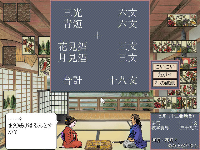 光荣公司1998年的老游戏,完成了坂本龙马的大政奉还,虽然没翻译,但是由于去年看了大河剧《龙马传》所以剧情无障碍,司马辽太郎说:“日本历史当中,坂本龙马是最有魅力的人物。”不同的两点是没娶楢崎龙,而是娶了千叶佐那。其二,最后没有被‘暗杀,美中不足的是最后片尾动画没有直接播放,老是未响应。