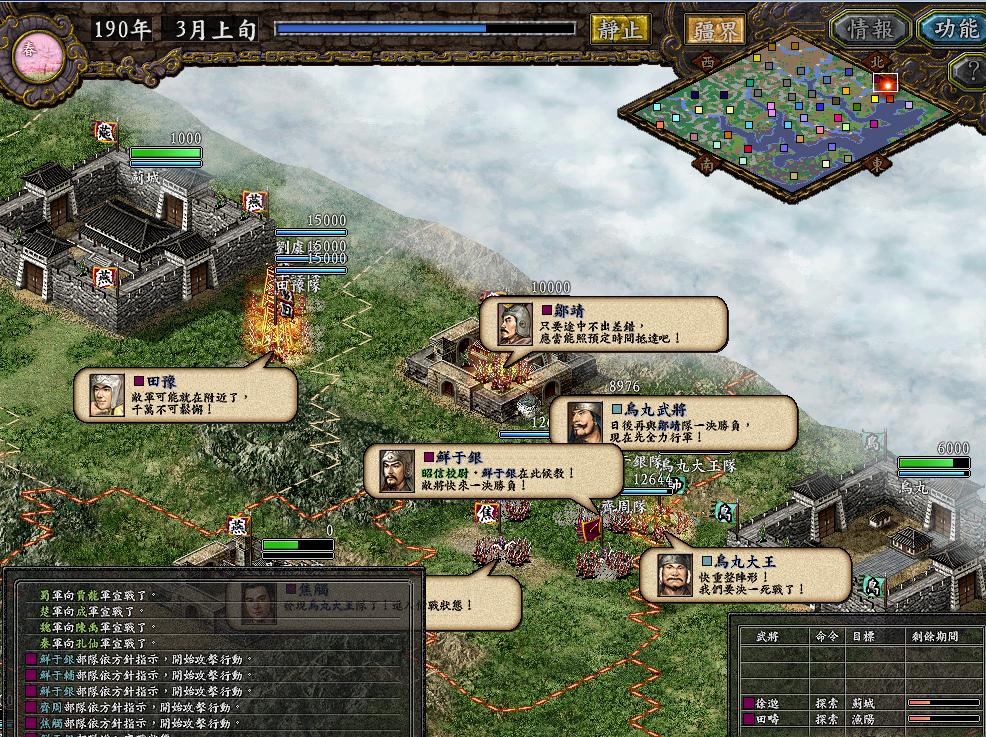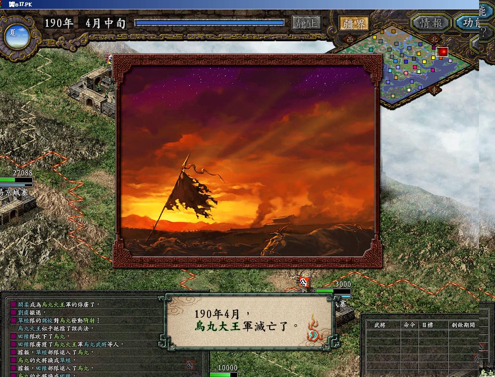 190年2月中旬,我军完成了进攻乌丸钱的兵力布局,刘虞亲自率中军6万1千人驻扎渔阳,鲜于银等四名骑兵将领带领5万2千骑兵驻守易京。2月下旬,我军正式向乌丸宣战,打响了攻略乌丸的第一枪。为此我以田豫、单经、刘虞率领三队井栏队进攻乌丸,中继点设在鲜城,邹靖带队1万方圆阵5天后出发迎战对方攻打井栏队的部队,另外齐周、鲜于银、鲜于辅、焦触各自带一队骑兵包抄乌丸出城部队,力图野战剿灭对方,为我军接下来井栏队攻城消耗对方兵力。对方果然派出乌丸大王和乌丸武将两队试图攻击我井栏队,正好被我围歼。战斗中乌丸的单挑给我放造成了很多麻烦,其乌丸城发起的连弩也给我军造成很多伤亡。但兵力的优势还是让我军迅速取得了野战的胜利,先后歼灭了对方的乌丸大王队和乌丸武将队。野战的胜利也使得我井栏三队顺利在乌丸城下回合。4月中旬,我军攻克乌丸!