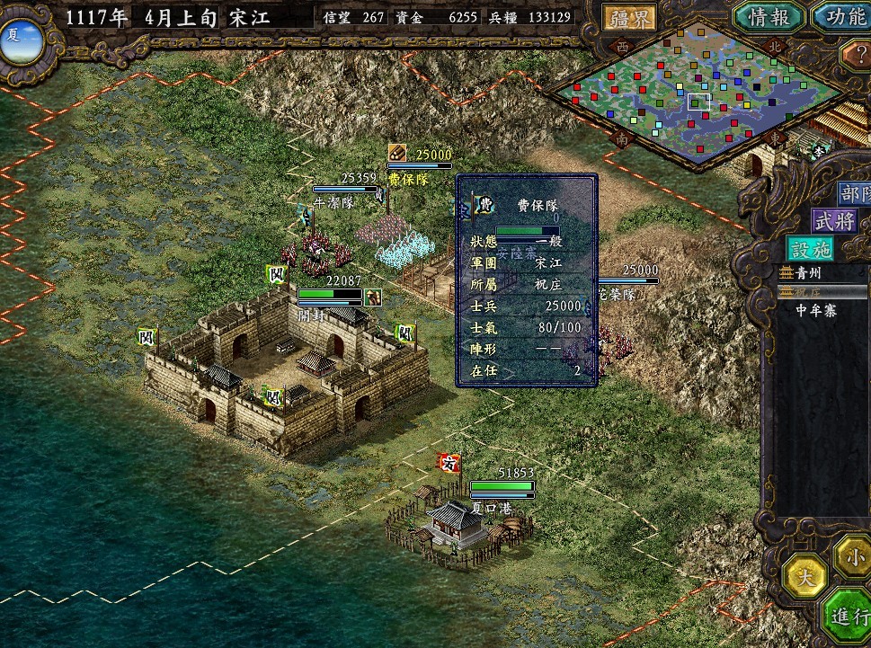 目前手下有86位梁山兄弟,坐拥河北,拥城10座, 不过邓飞兄弟永远的离开了我........在防御辽国的战斗中,被耶律辉斩首