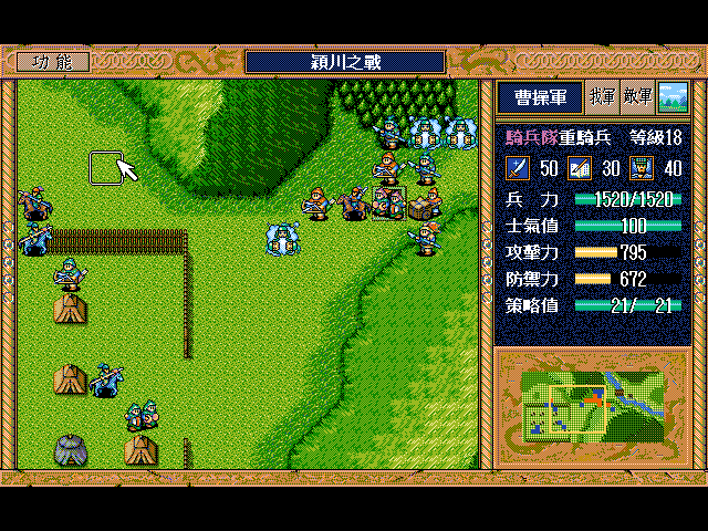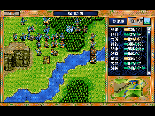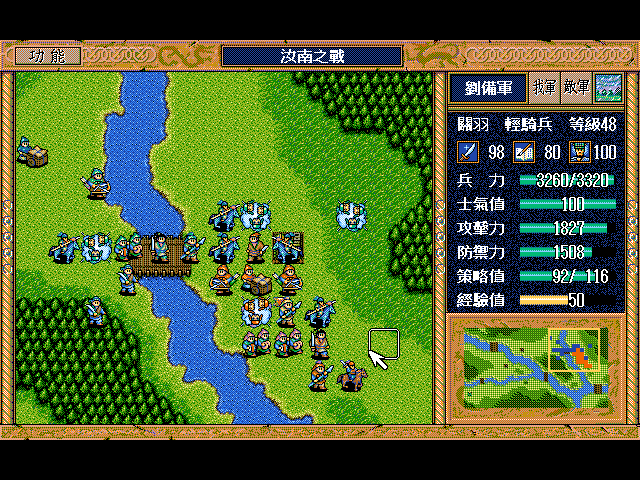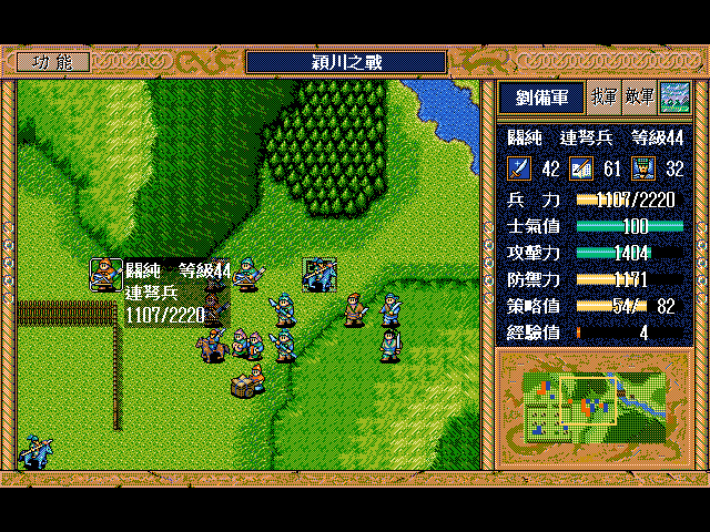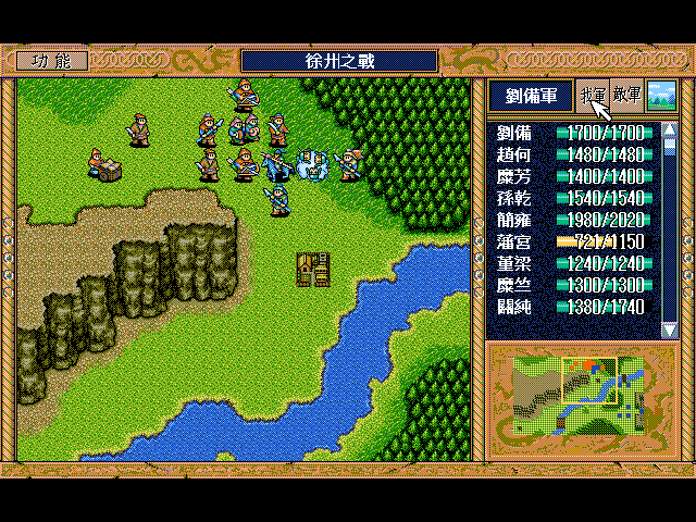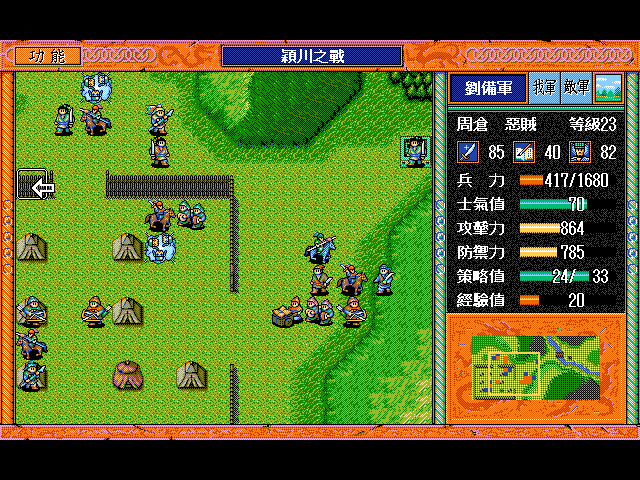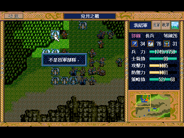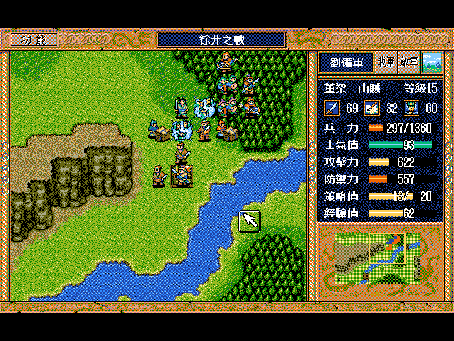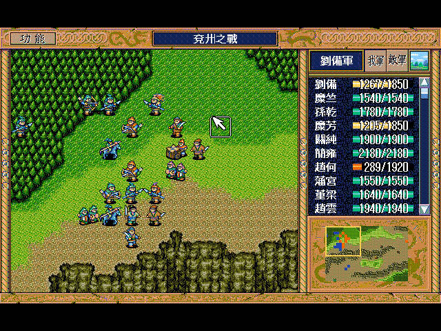 上回合刘备30多士气,170多血到图中位置,把刘辟激励醒,刘辟到图中位置激励刘备,和刘辟行动有关的都需要大量s/l。我军士气不满的人越多越好,现在没刘辟激励了。对最开始的山贼要牵制成功2次,敌军乐队来支援。
