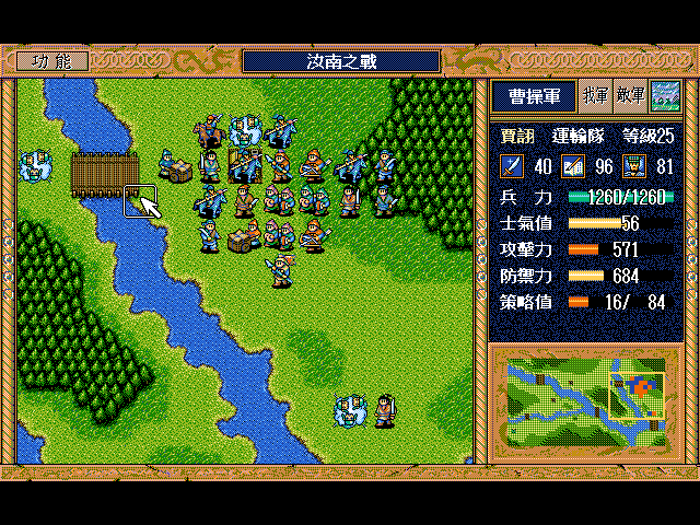 刘辟策略用完了,本回合开始攻击曹仁了。再让他被打一次,士气再低点就能一直攻击曹仁到最后了。我测试过,刘辟士气50砍到最后曹仁剩10多点血。上回合赵何把下方的骑兵反击死了,让贾诩来救济武术家。贾诩共84点策略,开始过第一个桥救济一次,剩下70,现在剩下56点。