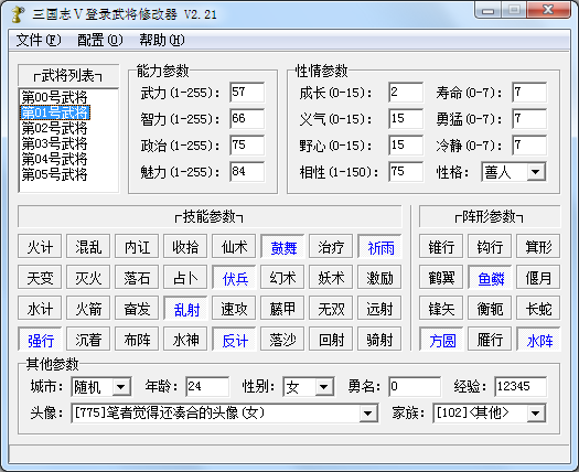 功能:可用于修改三国志5简体视窗版大量游戏参数;还可(1)修正个别宝物/武将名称的功能,(2)提供暗加武力调整功能,(3)调整宝物附加技能,(4)阵型附件参数调整等。